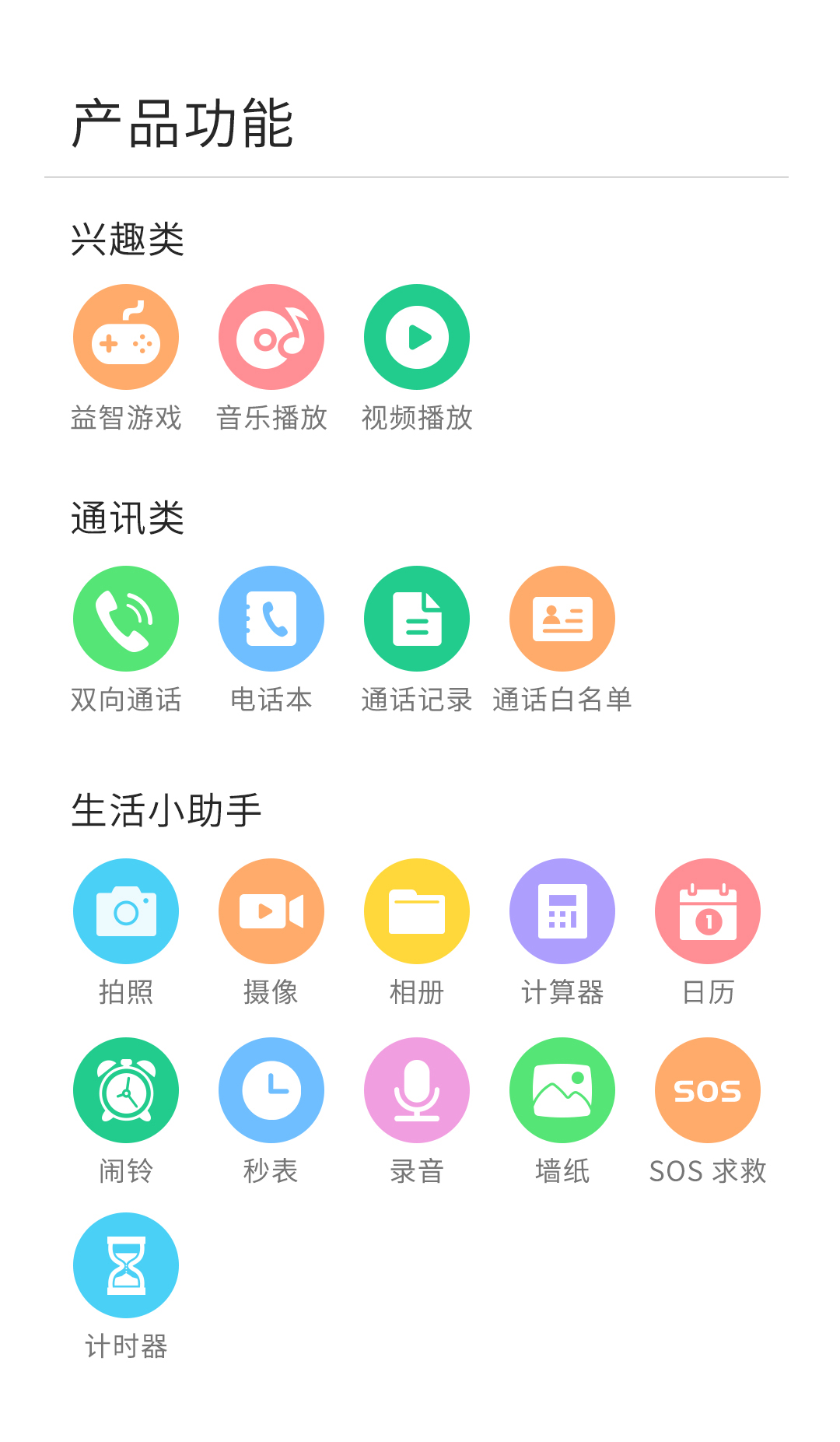 益智游戏、高清拍照、S0S 求救、音乐播放...