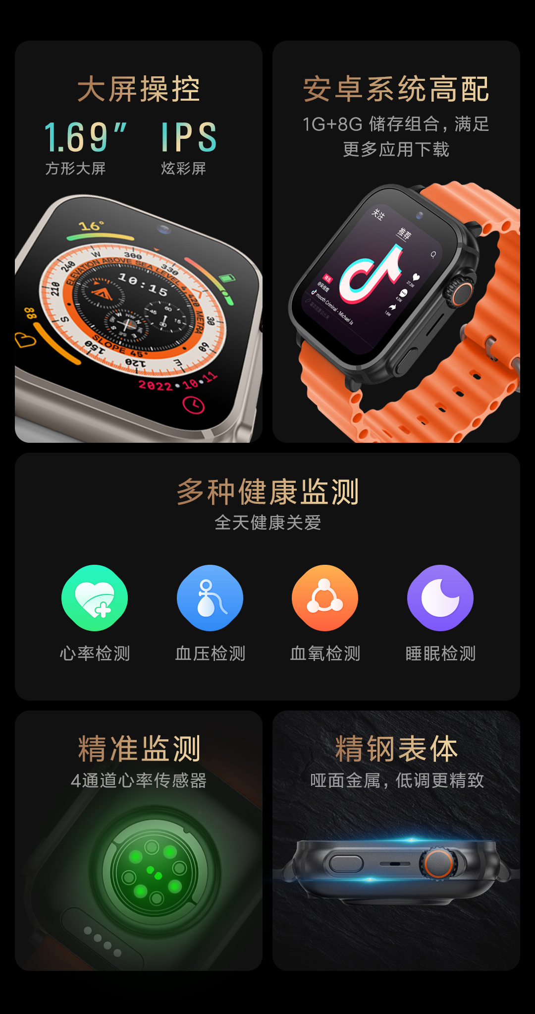 多种健康检测、视频通话、安卓系统、支付宝、抖音微信...